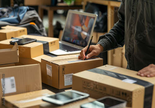 A warehouse with boxes ready for shipping online orders. The shipping manager is checking the orders. The company’s warehouse with orders packed in boxes.