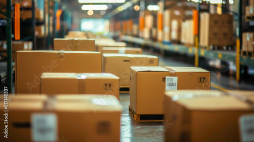 A warehouse with many boxes stacked on pallets. The boxes are all brown and have different sizes