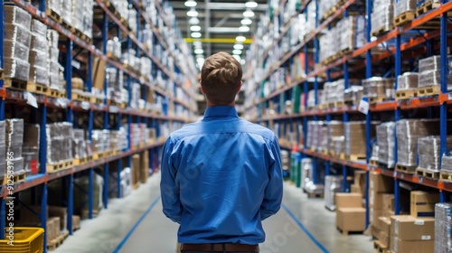 A warehouse worker inspects shelves lined with products, ensuring accurate inventory management and organization within a bustling distribution center