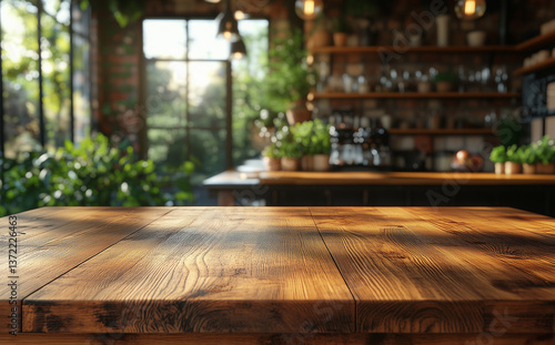 A warm and inviting cafe scene featuring a rustic wooden table, surrounded by lush greenery and bathed in natural sunlight