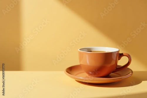 A warm beverage in a terracotta cup sits on a matching saucer, bathed in soft sunlight against a pale yellow backdrop.
