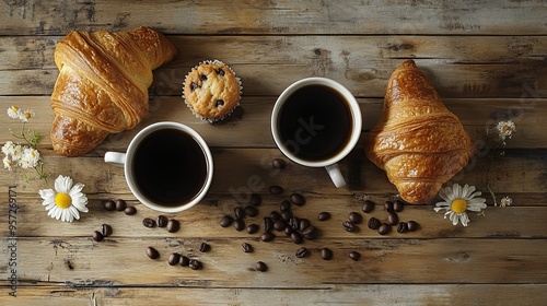 A warm breakfast setup featuring coffee, croissants, and a muffin on a rustic wooden table, perfect for morning indulgence.