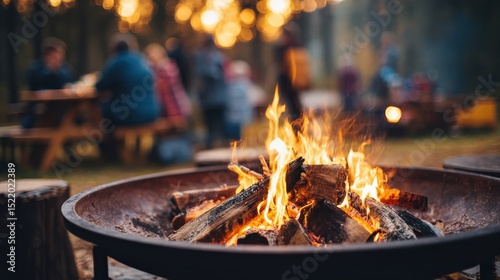 A warm campfire burns in the foreground, with people gathered and socializing at picnic tables in a softly lit outdoor setting.