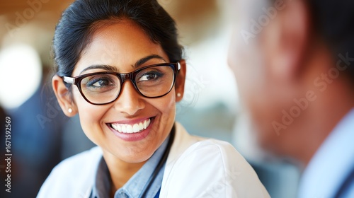 A warm, genuine smile radiates from a young woman with glasses, engaged in a pleasant conversation with someone just outside the frame, conveying connection and positivity.