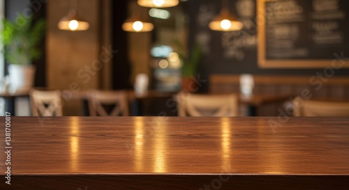 A warm wooden tabletop dominates a cozy café, softly lit by hanging bulbs. The blurred background highlights inviting chairs and lush greenery, creating a comfortable atmosphere.