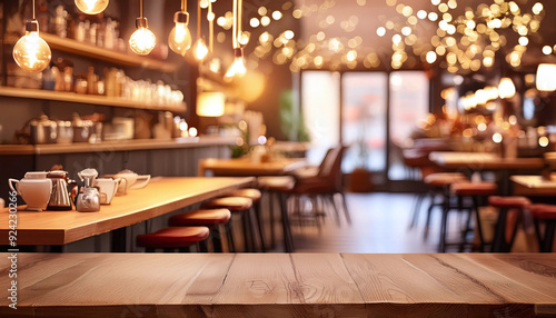 A warmly lit cafe interior with wooden tables and a blurred background. Generative AI.