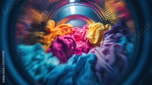 A washing machine drum filled with various colored fabrics is in motion, creating a vibrant mix of hues as the laundry spins. The warm afternoon light highlights the textures
