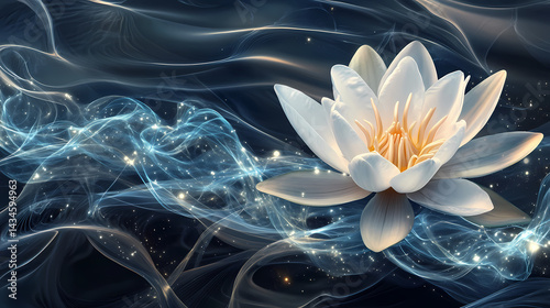 A water lily transcending reality quantum particle cascade with cream and cobalt energy waves. Quantum Blossom. Illustration