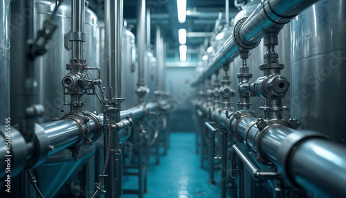 A water purification plant highlights complex piping and clean holding tanks, emphasizing advanced technology.