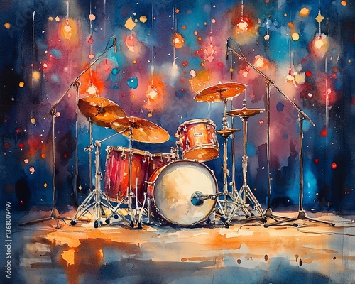 A watercolor depiction of a drum set on stage, lit by vibrant colored lights, filling the scene with a festive, upbeat musical atmosphere