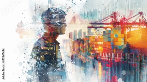 A watercolor illustration depicting a silhouette of a man, symbolic of a global citizen, against a backdrop of a bustling port with cargo containers, signifying the interconnectedness of international