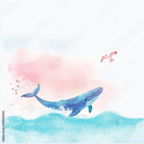A watercolor illustration of a whale breaching the ocean's surface, accompanied by a bird flying above against a soft, pastel background.