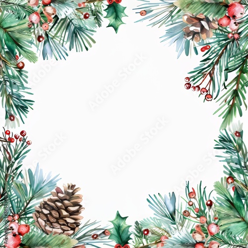 A watercolor modern Christmas square frame featuring fir branches, red berries, cones, a border and a wreath. A greeting card illustration for New Year's invitations. This illustration is hand drawn.