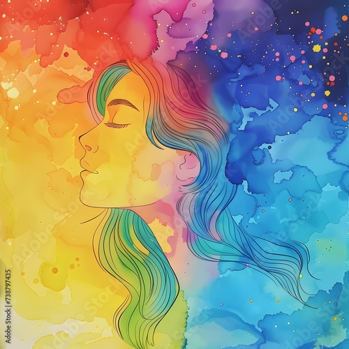 a watercolor painting of a girl with rainbow colors around her, in the style of fluid detailed background elements