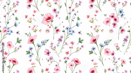 A watercolor seamless pattern depicting delicate wildflowers in shades of soft pink, lavender, and sky blue against a crisp white background. The style is loose and painterly, with vis.