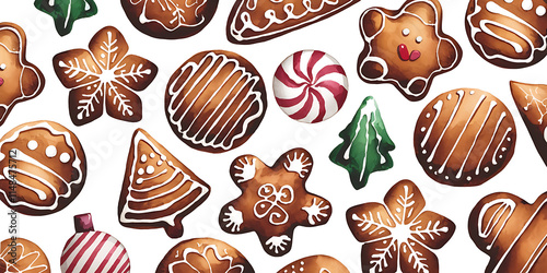 A watercolor style illustration of gingerbread cookies with various shapes and decorations, such as icing and sprinkles