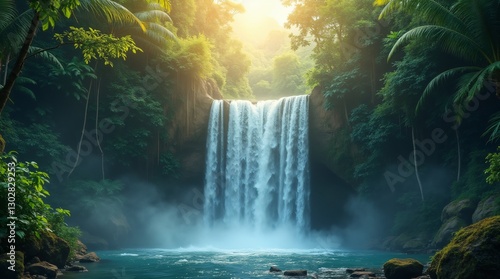 A waterfall in a tropical forest with colorful flowers, mist and sun rays breaking through the leaves