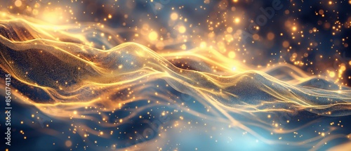 A wave of light is shown in a blue and yellow color. Digital particles wave and light abstract background