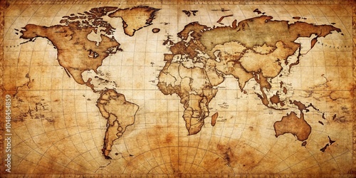 A weathered parchment world map depicting the continents in an antique cartographic style, with faded ink and a worn grid overlay
