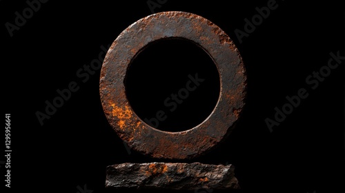 A weathered rusty ring sitting upon a small rectangular pedestal