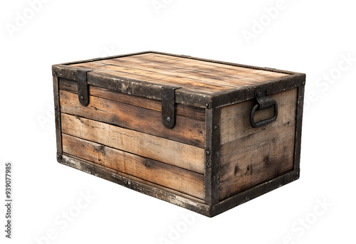 A weathered wooden chest with metal clasps and a handle sits closed on a transparent background.
