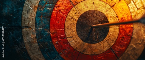 A weathered wooden target with an arrow hitting the bullseye, representing achievement and success.