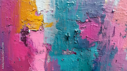 A weathered, worn-out abstract surface with mixed vibrant and muted colors, featuring heavy grunge textures, stains, and rough edges.