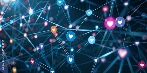 A web of interconnected social media icons with likes and shares, representing online networking and digital interaction