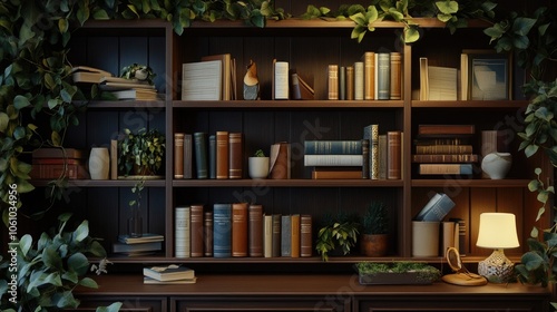 A well-lit bookshelf filled with a variety of books, with plants and a lamp adding to the cozy atmosphere.