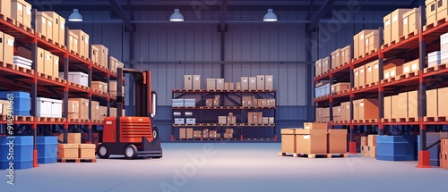 A well-organized warehouse with shelves of boxes and a forklift ready for inventory management and storage solutions.