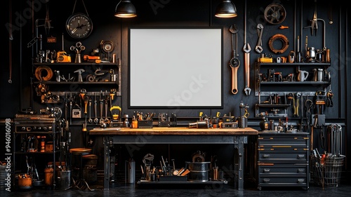 A well-organized workshop with a blank canvas ready for creation, surrounded by various tools and equipment in a professional setting.