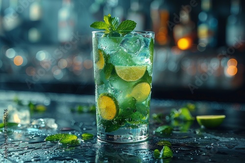 A well-presented mojito with lime wedges and mint leaves, captured in a dimly lit bar for a sophisticated look