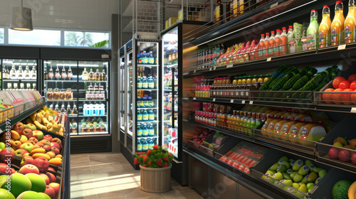 A well-stocked grocery store aisle, featuring vibrant fresh produce, juices, and an assortment of beverages neatly arranged.
