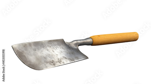 A wellused metal trowel with a wooden handle ideal for gardening and construction projects
