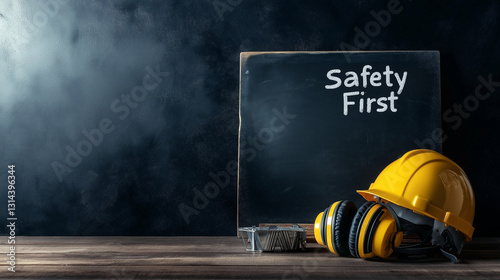 A well-worn blackboard with "Safety First" written in bold white chalk, placed on a sturdy wooden workbench, with a bright yellow hard hat and protective earmuffs neatly positioned