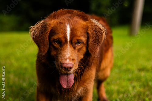 A wet brown dog with a white stripe on its head is panting on a green grassy field after play or a swim.