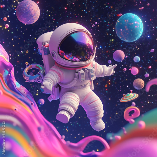 A whimsical 3D render of cute astronaut floating in space, surrounded by colorful planets and vibrant cosmic elements. scene is filled with sense of wonder and adventure