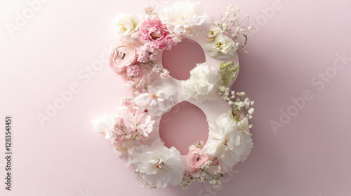 A whimsical arrangement of soft pink and white flowers embellishing the number eight for woman's day, set against a pastel pink background.