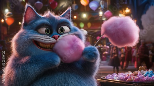 A whimsical blue cat enjoys cotton candy in a vibrant, festive setting.