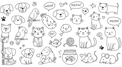 A whimsical collection of monochrome cartoon doodles featuring a variety of popular pets. The set includes a playful dog with a collar and a “woof” bubble, a striped cat announcing “meow,” a rabbit wi
