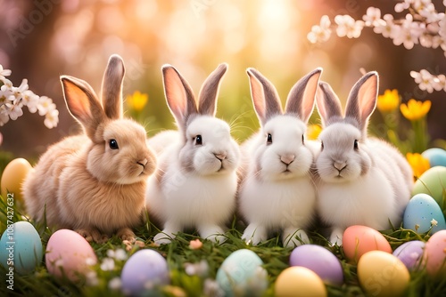 A whimsical easter scene with bunnies and eggs surrounded by spring flowers, Ai Generated
