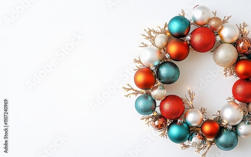 A whimsical holiday wreath made of colorful ornaments and fairy lights on a bright white surface