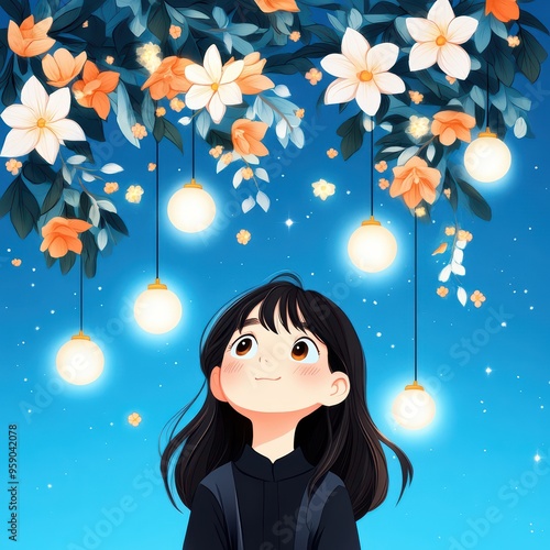 A whimsical illustration of a girl surrounded by glowing lights and blooming flowers under a starry sky, evoking wonder and serenity.