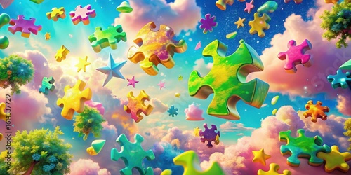 A Whimsical Journey Through a Colorful Puzzle-Filled Sky, Adorned with Lush Greenery and Sparkling Stars