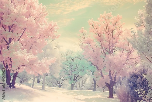 A whimsical, pastel-colored forest with trees in shades of pink, lavender, and mint green, under a soft, golden sky, creating a dreamy, fairytale-like atmosphere.