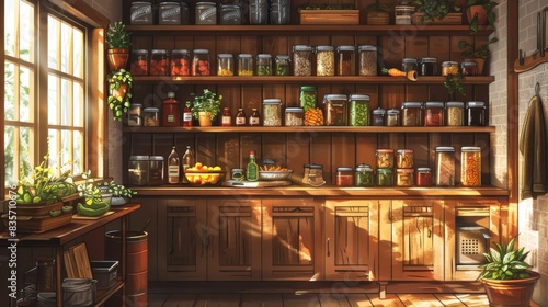 A whimsical portrayal of a DIY pantry makeover, showcasing a custom shelving unit made from reclaimed wood. The design is rustic and charming, with an emphasis on sustainability and creativity. The