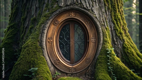 A whimsical round window with a wooden frame embedded in the moss-covered trunk of a large tree in a softly lit, enchanted forest