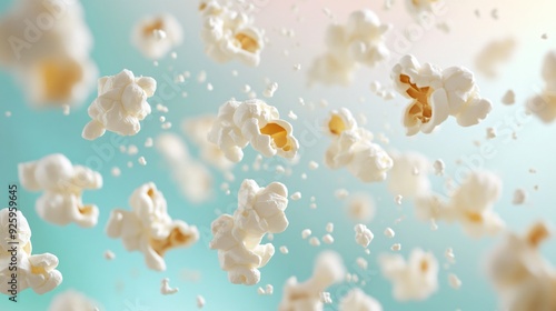 A whimsical scene of popcorn raining down from above, with fluffy white kernels floating against a pastel-colored background