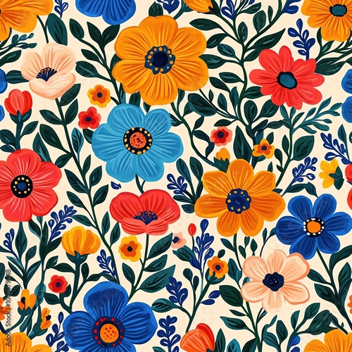 A whimsical seamless pattern with playful, oversized flowers in bright, contrasting colors