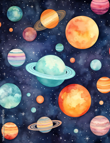 A whimsical watercolor illustration of the solar system, featuring vibrant colors and detailed planets against an endless starry sky